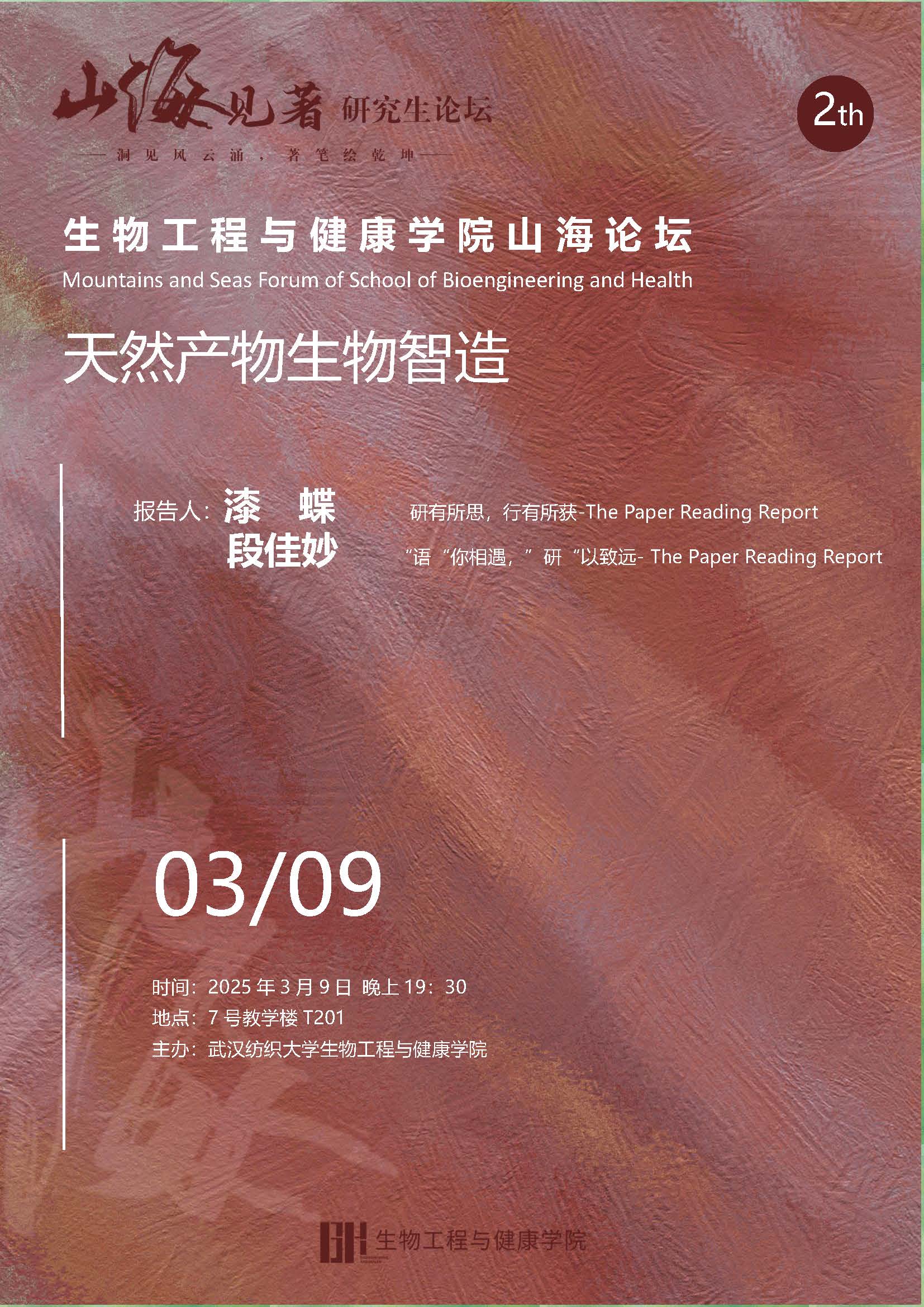 3月9日,williamhill英国中文主办的学术活动“山海论坛”于7号教学楼T201教室顺利召开。本期论坛延续“天然产物生物智造”的主题,由漆蝶、段佳妙两位同学作专题报告,主题分别为“研有所思,行有所获”与“‘语’你相遇,‘研’以致远”。