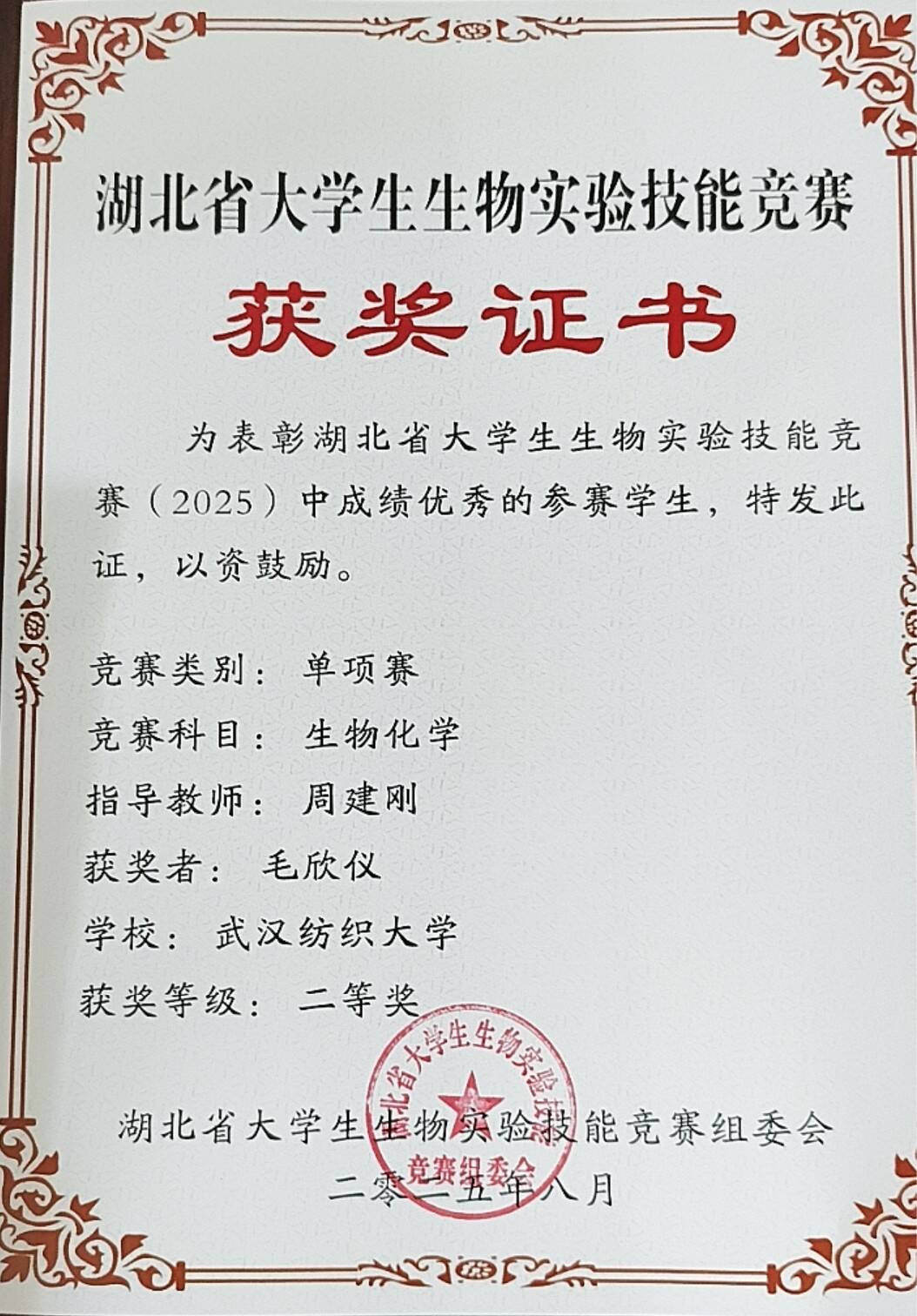 此次比赛需要参赛选手在规定时间内完成要求的各项操作,考验了选手们的实验操作和数据分析能力,经过角逐,我院生物工程专业2023级本科生毛欣仪在周建刚老师指导下斩获省级二等奖。