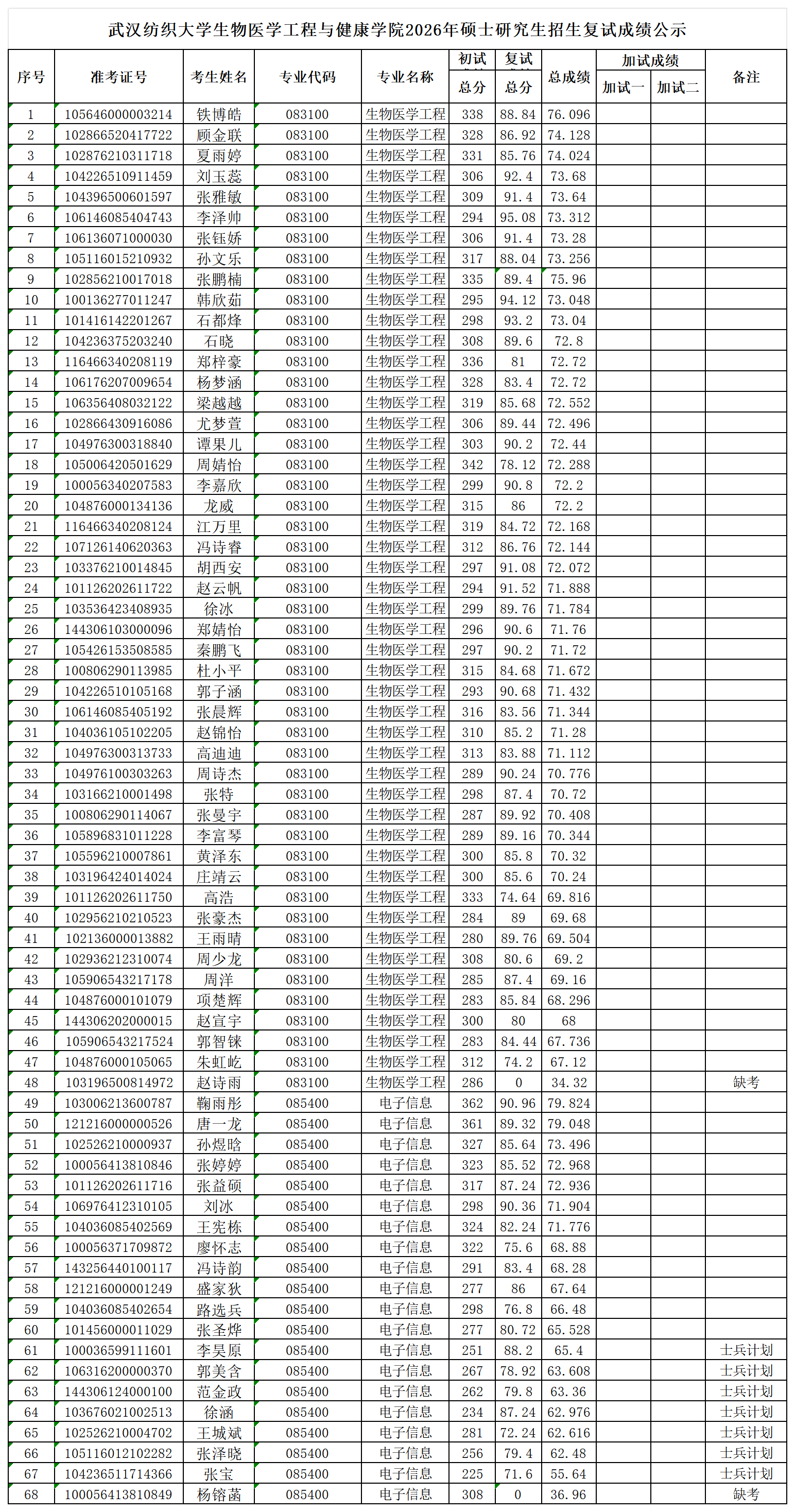 公示时间:2026年4月9日-4月11日。如对公示成绩有异议,在公示期内,可据实向生物医学工程与健康学院办公室反映。电话:魏老师 027-59367214,邮箱:9425019@wtu.edu.cn。