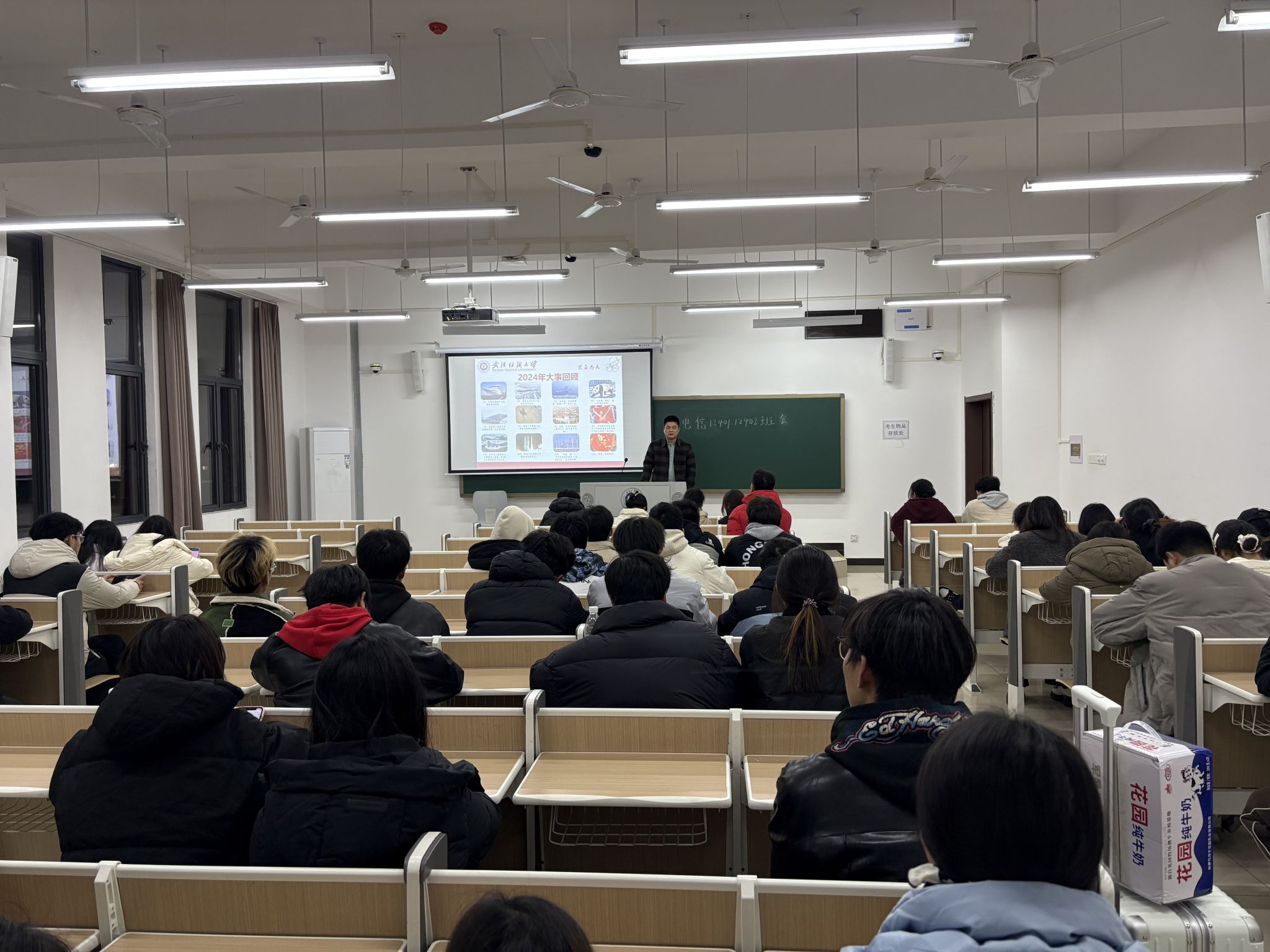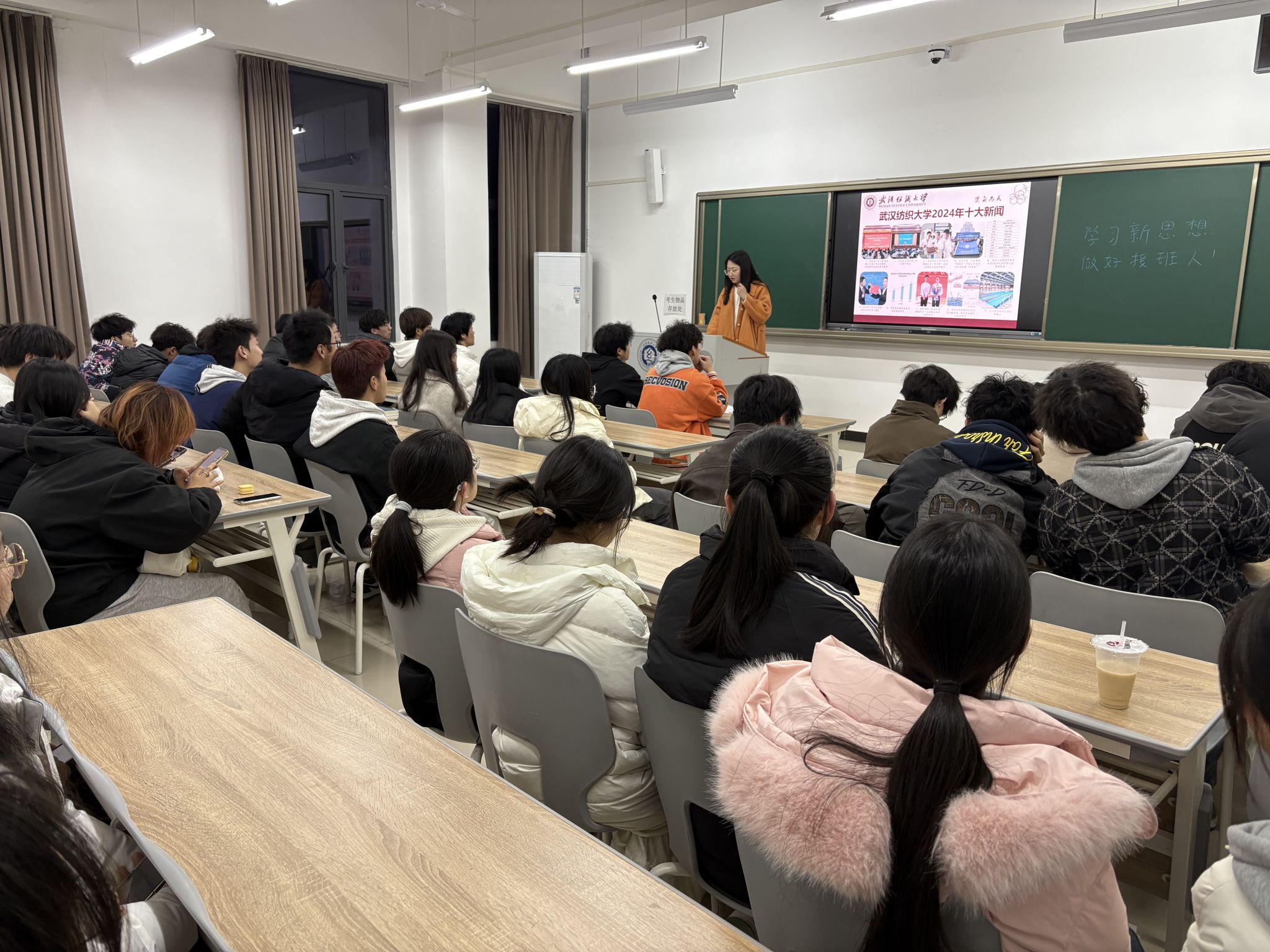 班会伊始,辅导员和班主任对各班对学生到校情况、在途学生情况以及延迟返校名单事由进行复核,落实和上报未报到学生的名单及事由。对于未到的学生,班主任和辅导员们逐一进行联系,确保掌握每一位学生的动态。辅导员朱一雷引用了习近平总书记2025年的新春祝词,强调我们的奋斗、努力及每一步行动都在为国家的建设贡献力量。回顾2024年,中国所取得的重大成就进一步证明了国家的每一步进步都与每位国民息息相关。纺大在2024年的辉煌,这是全体师生共同努力的结果。正如纺大新春贺词所言,“唯有拼搏方能致远”,每位同学都应当怀揣拼搏精神,勇往直前。