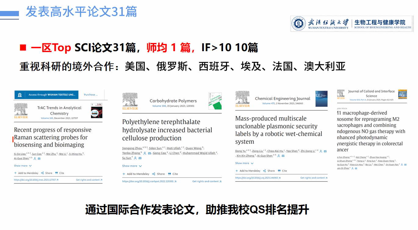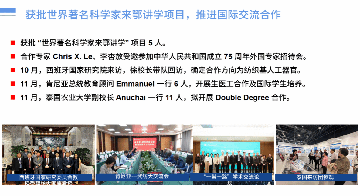 三是拓展合作,搭建国际交流桥梁。学院申报“‘健康中国’引领下纺织纤维材料学科创新人才培养项目”获国家留学基金委国际人才培养合作项目立项,这是我校首次获批该项目。获批“世界著名科学家来鄂讲学计划”项目5人。学院与西班牙高等学术研究委员会和泰国农业大学签署了2项MOU,与肯尼亚高级科学与技术学院大学、肯尼亚梅鲁科技大学达成了MOU签署意向。围绕生物工程和食品安全等议题与泰国农业大学联合主办2场国际学术会议。与肯尼亚专家访问团联合举办国际交流会议,重点探讨“一带一路”合作。成功举办斯坦福大学校友会暨医管工交叉学术论坛。学院组织教师团队赴泰国参加2024国际霉菌毒素学与食品安全大会及波兰参加第六届国际药物分析前沿进展学术会议并作报告,赴罗马参加第28届国际拉曼光谱大会。