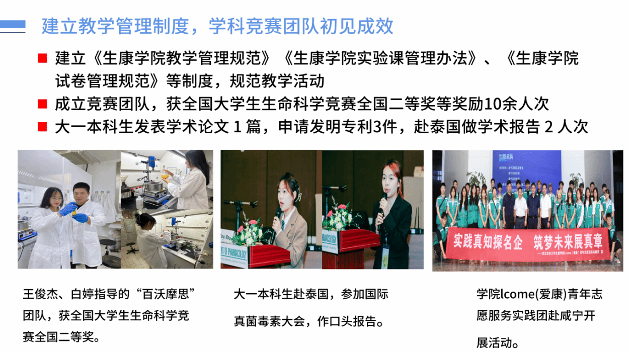 一是精育英才,打造人才培养高地。学院把加强党的建设作为学生工作的坚强保证,举办“书记思政第一课”2期、“师生茶座”4期、团课5期。开展了“佩团徽、亮身份、树形象”的团学干部亮牌工程,从思想上引领学生树立正确价值观。依托国家重点实验室,2024年招收学术型硕士研究生30余人,首次招收国际留学生研究生2人。学院围绕将学生工作与专业教育紧密结合的思路,建立教学管理制度,积极发挥第二课堂育人作用,围绕学科、学术、学业创设学生活动品牌,深挖学科育人资源。建立学科竞赛团队制度,学科竞赛初见成效,荣获全国大学生生命科学竞赛全国二等奖等学科竞赛奖项12项。与深圳华大基因、武汉人福药业、武汉药明康德等10余家企业合作,共建本科生实习实践及就业基地。