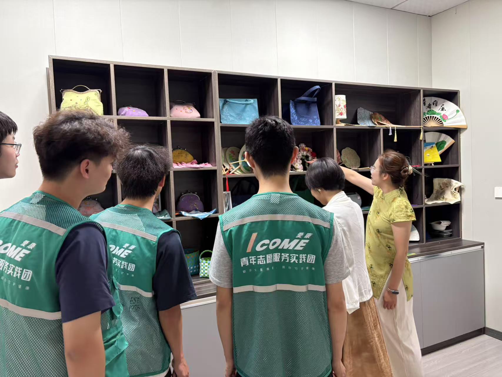 仪式结束后,志愿者与社区居民携手参观社区文化长廊。长廊内陈列的汉绣、扎染等精美手工艺品,均由志愿者与社区居民共同创作完成,飞针走线间传承非遗文化,斑斓色彩中凝聚邻里温情,成为社区一道亮丽的文化风景线。居民们亲身体验手工制作,一针一线间,传统艺术不再是博物馆里的“静态展品”,而是社区生活中“可触摸、可参与”的文化体验。从图案设计到手工实操,居民们在互动中感受非遗魅力,学生也在文化传承实践里,深化对传统文化创新传播的思考,让校社文化交流实现“双向奔赴”。