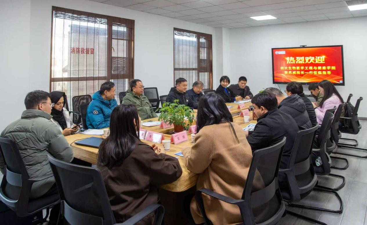 12月26日,学院教职工首先抵达中农华威制药股份有限公司。企业董事长兼总经理游锡火等领导热情接待,邀请学院团队参观企业展厅,深入实验室了解生物医药研发成果,双方围绕人才培养、科研合作、实习就业等议题展开座谈。会上,游锡火详细介绍了企业发展历程、核心业务布局及人才需求导向,重点阐述了公司在生物医学、人畜共患病防治等领域的技术优势与产业布局,表达了共建人才培养体系、联合攻关技术难题的迫切需求。学院执行院长张兆威首先对中农华威制药股份有限公司的热情接待表示感谢,并强调学院始终以“服务健康产业发展”为导向,致力于培养兼具理论功底与实践能力的复合型人才,希望与企业建立长效合作机制。