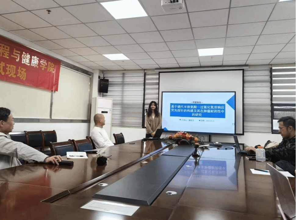 董世玉同学在漆亚林老师的指导下,汇报“基于硒代半胱氨酸—过氧化氢双响应荧光探针的构建及其在肿瘤耐药性中的研究”。针对肿瘤治疗中肿瘤耐药性对治疗造成的极大干扰,铁死亡的生化调控逻辑及动态演进过程不明确等问题,团队创新性地构建Sec/H2O2双响应近红外荧光探针。通过该探针的双通道信号强度与比值变化,构建氧化—还原双参数判读体系,以此特异性识别铁死亡的发生。并在肿瘤耐药及淋巴结转移模型中解析其动态轨迹、临界区间及可调控性。为铁死亡特异性识别、细胞命运可塑性评价、靶向分子筛选及干预策略优化提供原创工具与实验依据。
