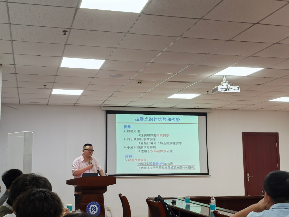 报告中,李教授作题为“拉曼光谱分析”学术报告,李教授首先从翡翠、钻石等珠宝的鉴别引出拉曼光谱的特性及其实用价值,并详细介绍了表面增强拉曼散射(SERS)的分子指纹和高灵敏度的优势。然而,目前的SERS增强效应只局域于粗糙的Au、Ag、Cu等材料表面,存在材料普适性和形貌普适性的长期瓶颈,极大地限制了SERS技术的实际应用。针对两大瓶颈,李教授团队通过构筑不同功能性的壳层隔绝纳米粒子,建立和发展了"借力"策略和壳层隔绝纳米粒子增强拉曼光谱(SHINERS)技术,突破传统SERS表界面分析对材料与形貌的限制,提升拉曼光谱的表面检测灵敏度和普适性。在基础研究方面,李教授团队利用自主开发的SHINERS技术创新性地研究表界面反应过程,致力于让纳米催化剂表面的电化学反应过程“看得见”甚至“看得清”,通过捕获不同表界面反应中间物种(OOH*、OH*、O2-等)的直接拉曼光谱,从分子水平上阐明氧还原、氢氧化、CO2还原等重要反应的机理与构效关系,以及界面水分子取向和结构对反应机制的调控作用,为长期存在争议的电化学/催化反应机理提供直接实验证据。在应用基础研究方面,李教授介绍了其团队开发的通用性便携式拉曼光谱仪及其配套的纳米增强芯片,并将其成功用于痕量毒品残留现场快检和呼吸道疾病大规模筛查,其中毒品快检技术已在深圳海关和南宁海关进行推广应用,并取得了良好效果。在互动交流环节,参会师生们就SERS技术解决表界面电化学、催化和快检领域的基础科学问题积极提问,与李教授进行了深入的讨论。
